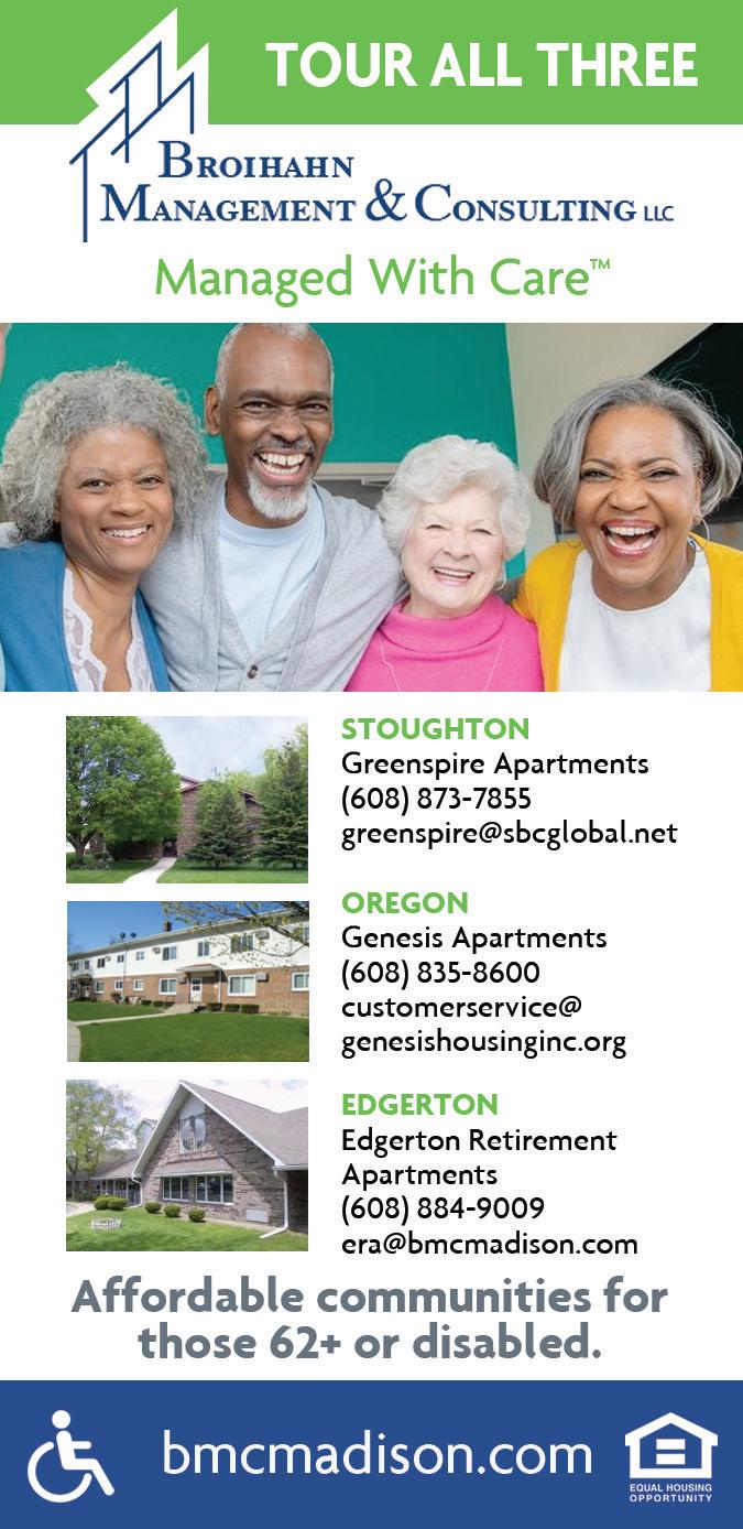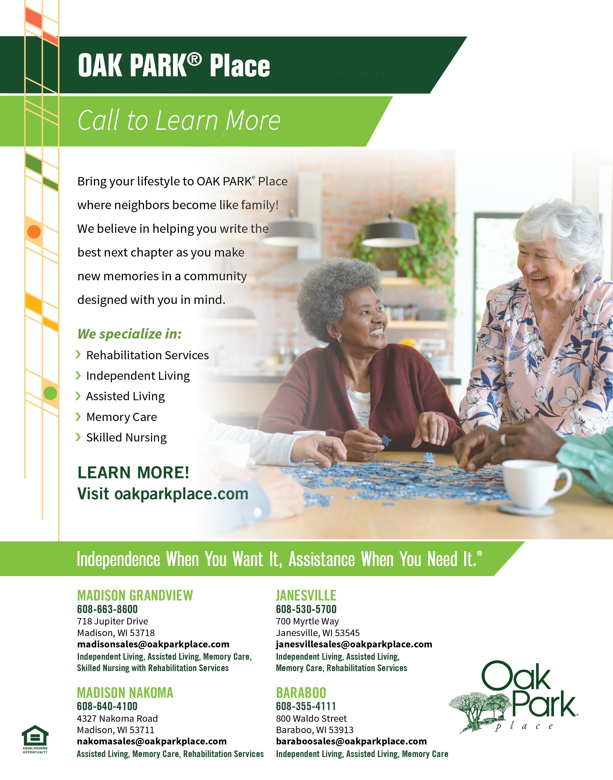 Apartments • Assisted Living Memory Care MindPeace ofPeace of For over 25 years, families have felt the comfort of knowing their loved one is in good hands. Still independent, with support when needed. Exceptional staff and nurses make all the difference. Depend on The Pines. Call today to learn more! 608-643-5433 pinesprairiedusac.com 1050 Prairie St., Prairie du Sac Senior Living MADISON GAS & ELECTRIC Life-Sustaining Equipment (608) 252-7000 mge.com/lifesupport SSM HEALTH AT HOME (800) 924-2273 hahwi.info@ssmhealth.com ssmhealthathomewi.com We provide a variety of equipment, supplies, and services to help patients