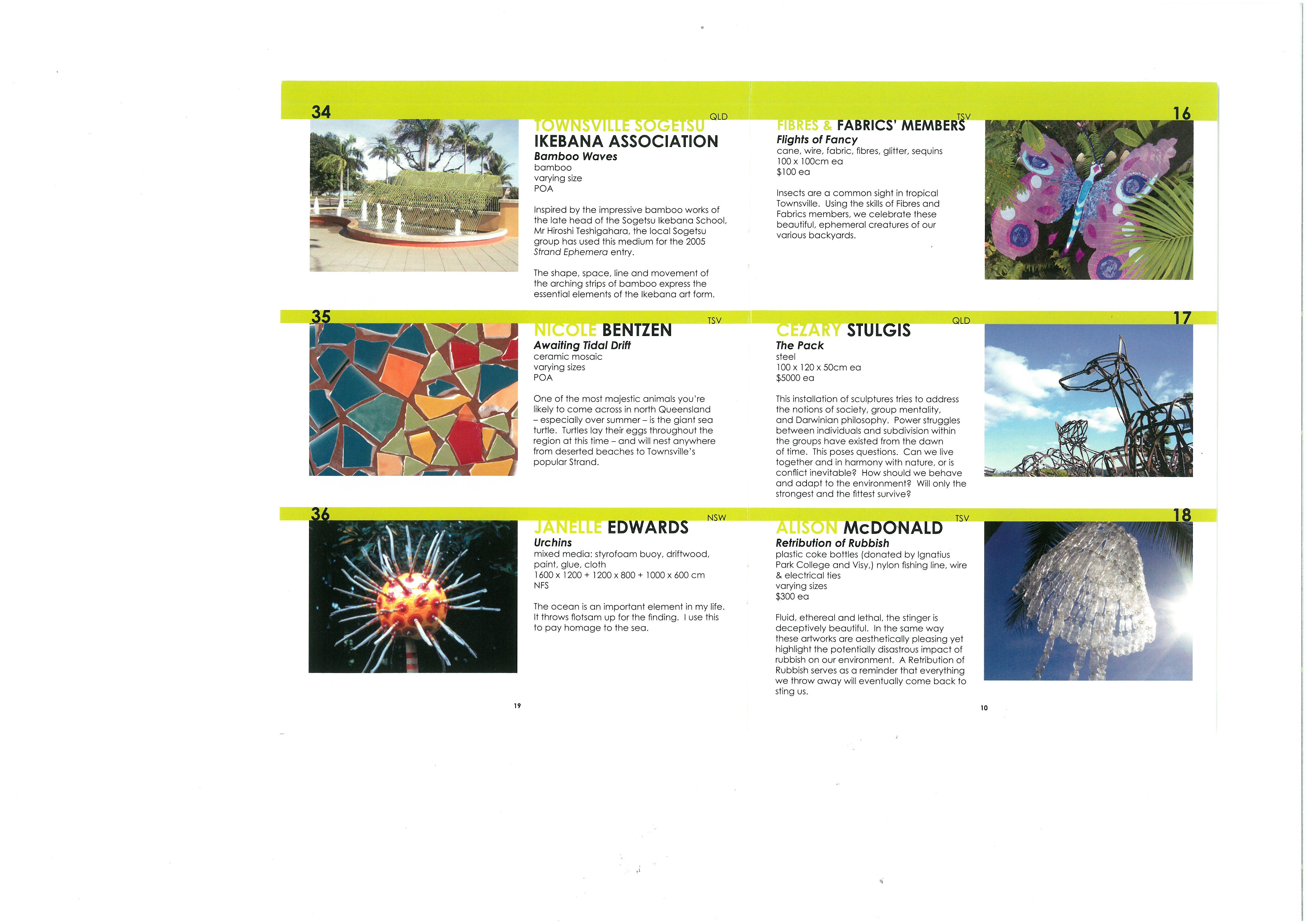 Initiated and organised by Pere Tucker Regional Gallery, Strand Ephemera is held biennially, making 2005 the 3rd event. Each event has benefited from the previous, this year the public program has been expanded, and with more artists, the exhibition can claim to be "bigger and better than ever." Townsville's magnificent Strand will be further enriched by 43 site-specific sculptures by artists from across Australia, including Townsville's favourite artists. Held biennially, this is the 3rd Strand Ephemera, an event eagerly awaited in the cultural program of our city.