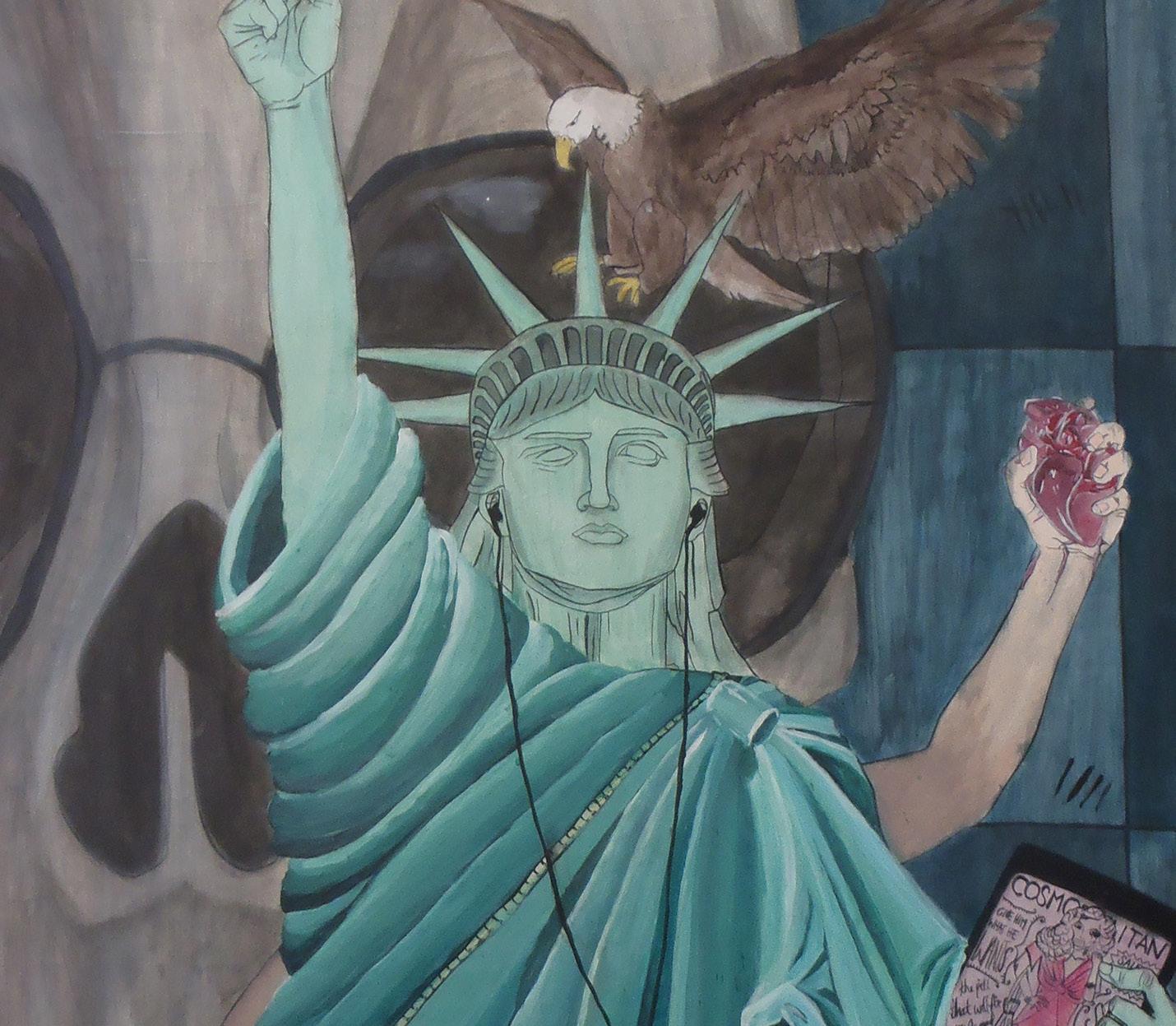The focal point of this work is The Statue of Liberty - an internationally renowned symbol of freedom. In the modern world, youth are seen as filled with opportunity, potential and freedom. However, as this work depicts, young women in particular are faced with far more challenges than society reveals.