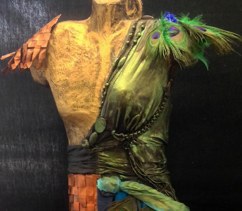 Mannequin bust, newspaper, gesso, rubbing gold, copper sheet, feathers, cotton, silk