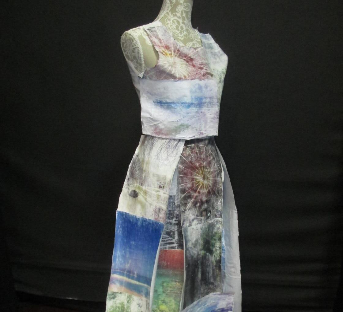 This artwork represents my own physical journey. When people travel to places they create memories through photographs. These are my memories presented by wearable art. I love to travel and have been to many places. While the underskirt itself is plain, the layered photographs travel over the surface in a circular motion.