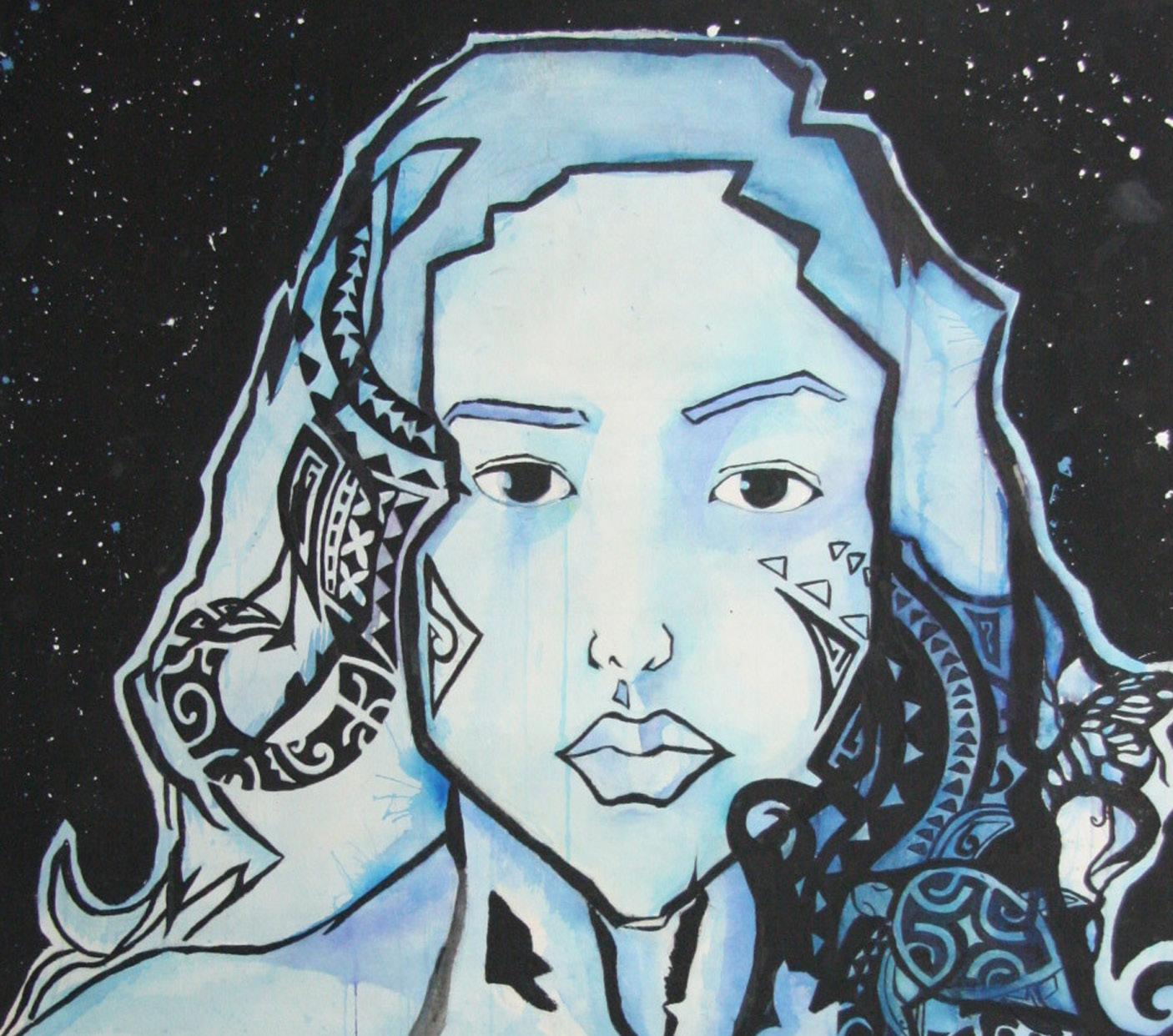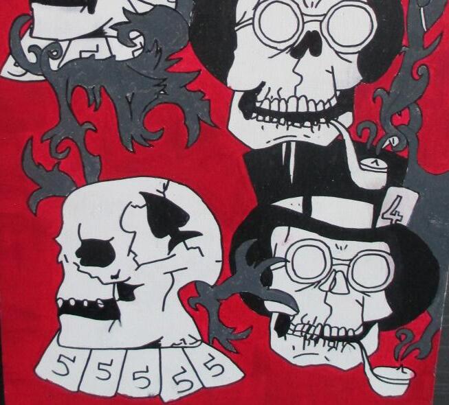 This artwork is a tribute to my aunty as she died four years ago from cancer. She was the most loving and caring person who put other people’s problems before her own. The skulls and coffin signify her death caused by cancer, while the number 5 signifies my lucky number and feelings of hope.