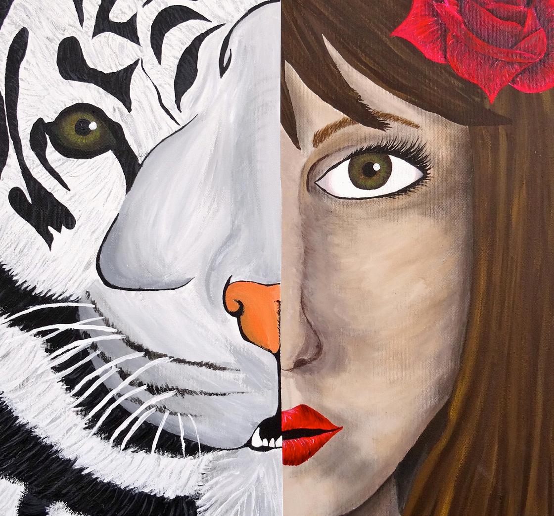 This mixed media self-portrait painting aims to communicate who I am beyond my physical appearance. The wolf represents my love for and protection of family and friends, while the swan indicates my gentle and passionate nature. Placed central in the artwork is a paintbrush in my mouth, which symbolises my passion for art.