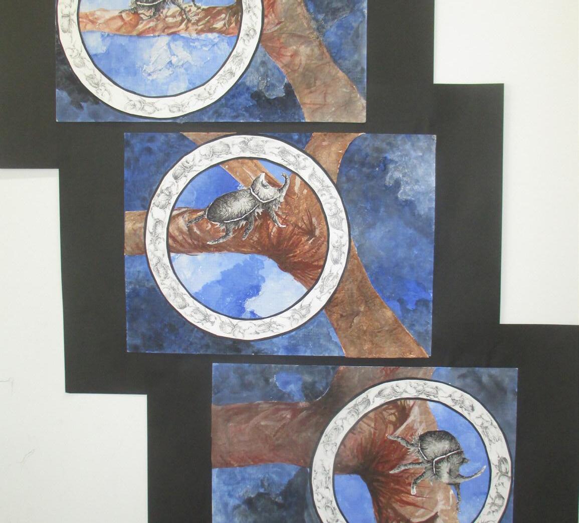 I have focused on the little things in life as I feel they make up the big things. The journey that I chose to explore in my artwork was that of the Rhinoceros beetle. Normally the beetle is seen as big and bulky, but I have tried to illustrate how small and delicate it actually is.