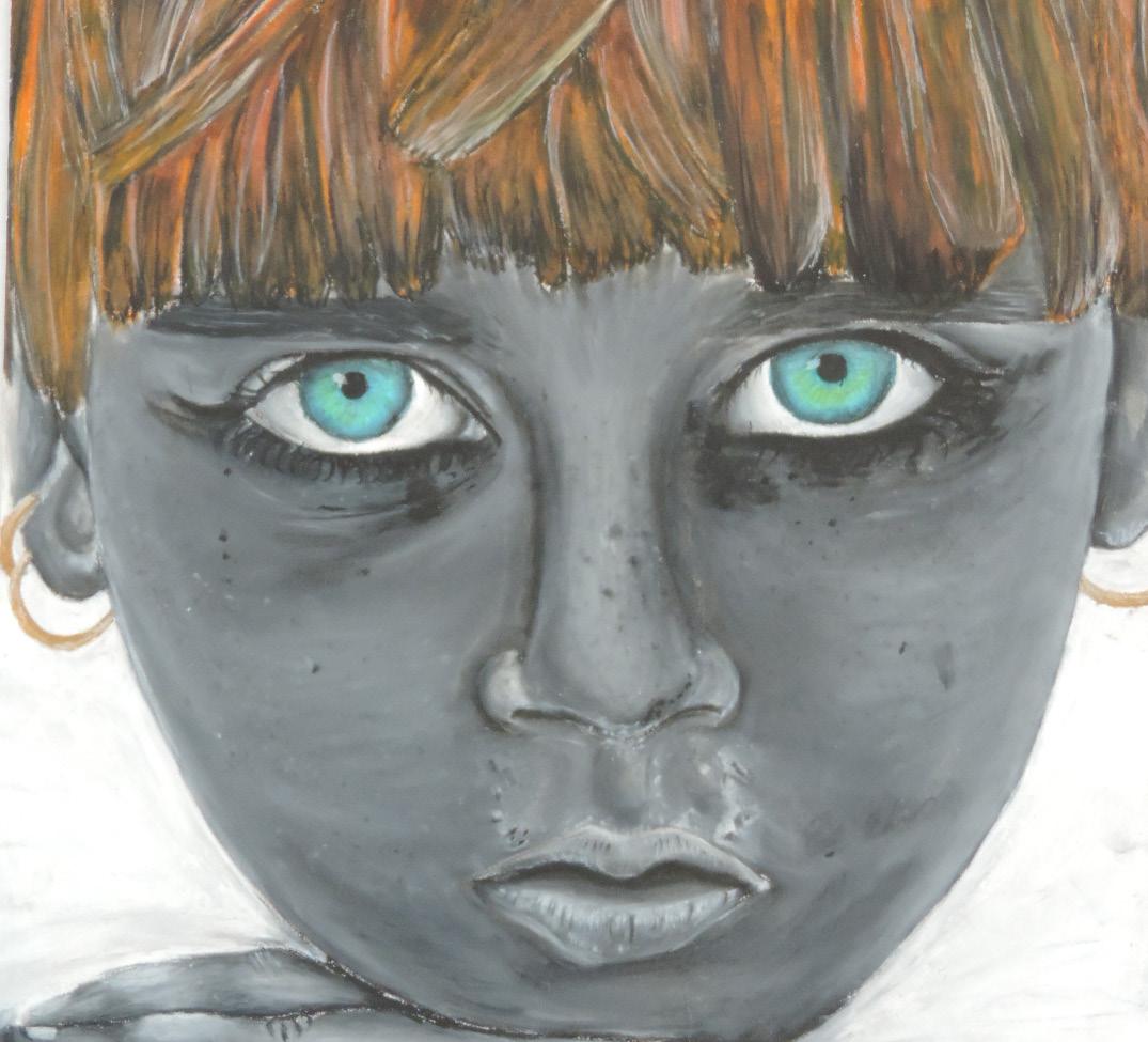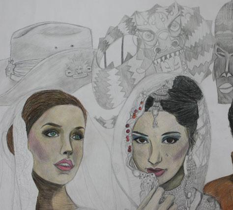 This artwork shows that sometimes to display your wisdom you have to hide behind a mask. The owl mask symbolises wisdom. The girl wears the mask to show adults she is not a child and she has wisdom. The drawing was created using shading and blending to reproduce the different surfaces.