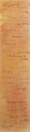 This five panel painting begins with the beauty of the undisturbed landscape – the “land as it is and always was” 8 The colour palette for this particular panel is important, as it links closely to two narrower panels that punctuate the work. These two panels include “names of Indigenous languages relating roughly to the areas which most inspired these works.” 9 Though the artist is quick to point out it is far from a conclusive list of the language groups, the intent is to pay tribute to the traditional custodians of the land, their connection to country and understanding of it.