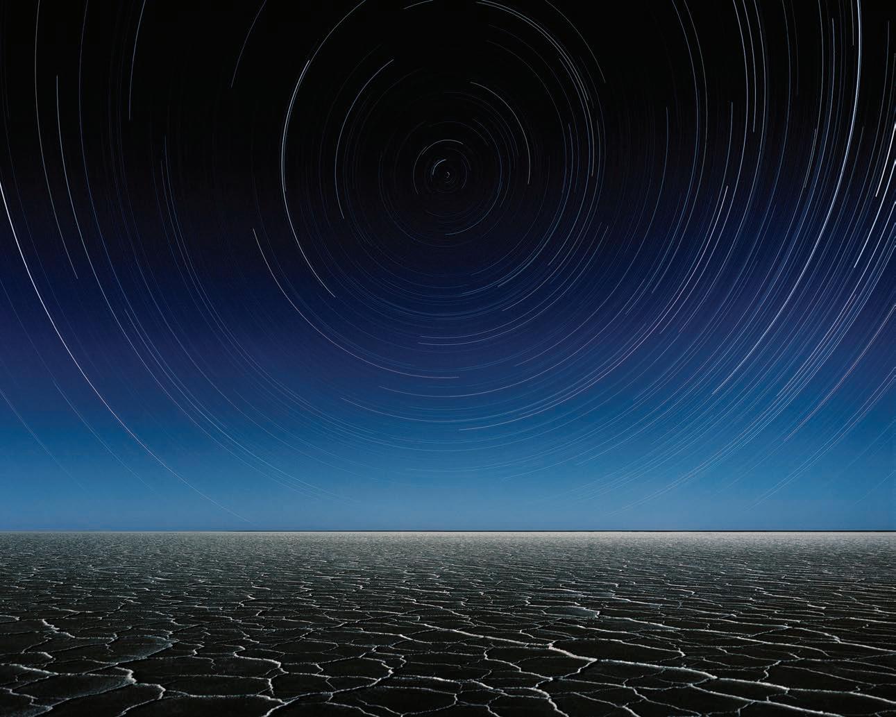Bereft of features punctuating the horizon line in every direction, Fredericks surrenders himself to the void, giving himself over to something more significant than himself. He ‘dissolves’ into the endless cracked earth, the brilliant light, the formidable cloud formations and the seemingly infinite night sky.