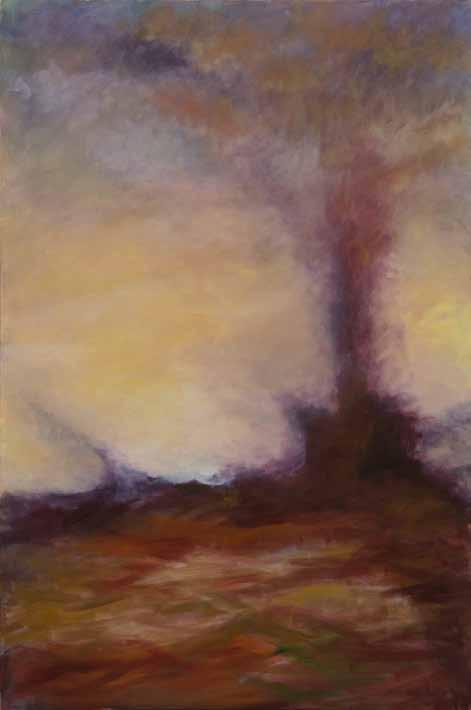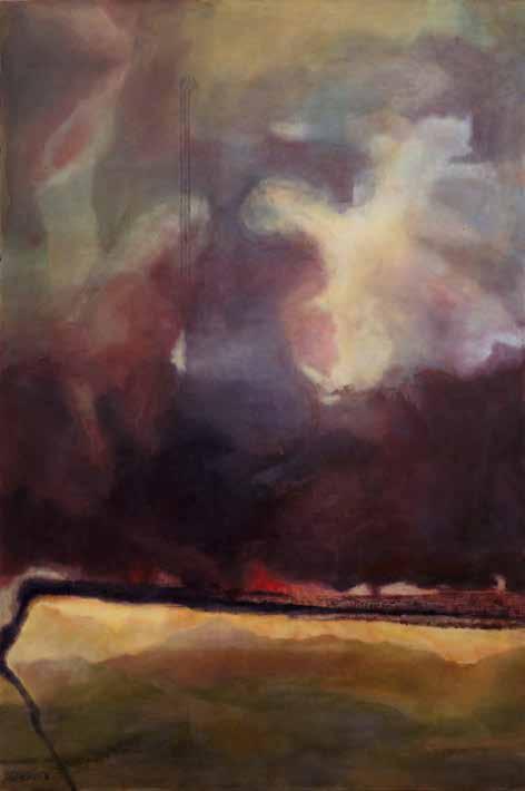 To escape the summer heat of Townsville, Cavanagh would head to the Tablelands after work on Fridays. Dusk, captures that moment of arrival…the rich texture of the Atherton Tablelands at dusk, the cool moist air and the feeling of relief and softening of tension that respite brings, whereas in the related work Dawn, there is a feeling of expectation, of new beginnings, the landscape and sky just touched by light.