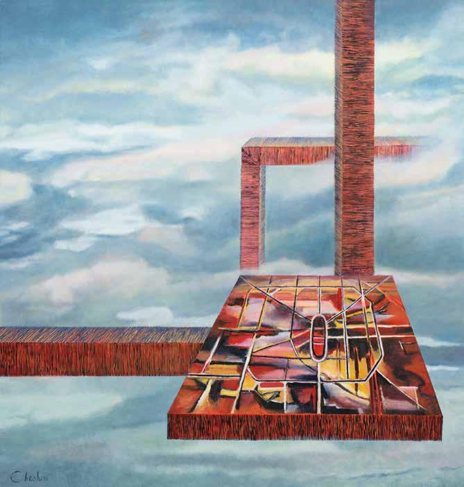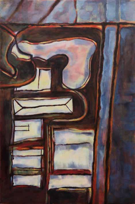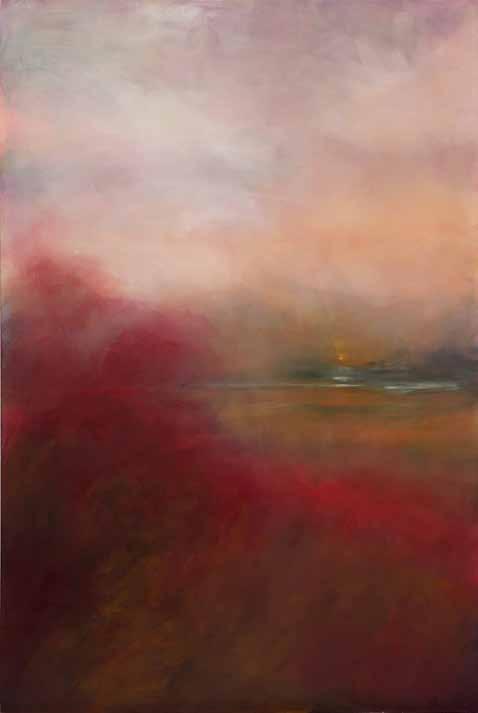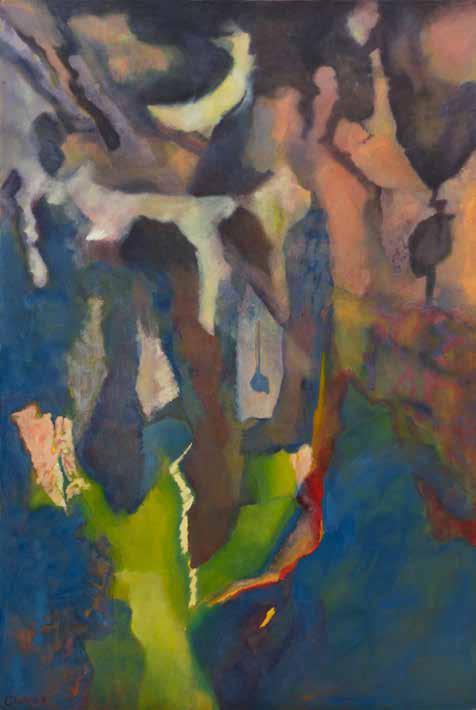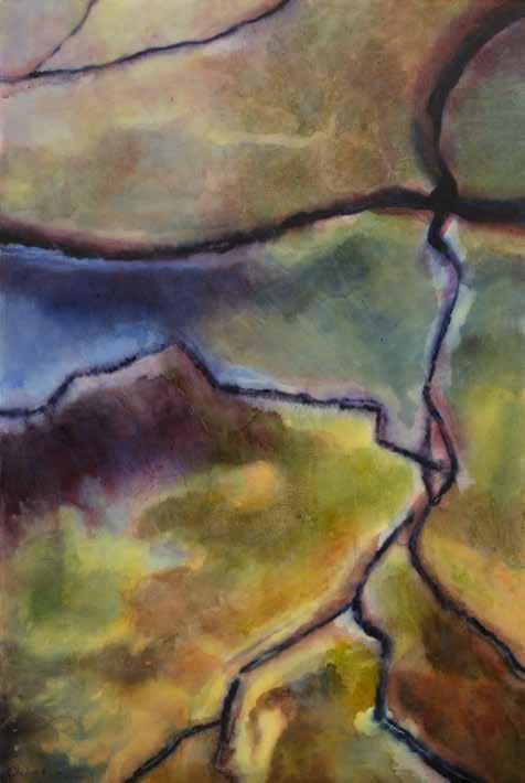 Meeting Place alludes to Cheshire’s time spent in tertiary learning places and the ordered chaos that seems integral to such institutions. The essence of place found here influenced by study, teaching and developing friendships. The meditative cooler palette Cheshire has used in Active Silence imbues the work with a sense of quietness and tranquillity. The work references the outskirts of the Atherton Tablelands and of Kerala, places Cheshire refers to as her “thin places”…Places where she experienced a feeling of refreshment and a re-vitalising of the spirit.
