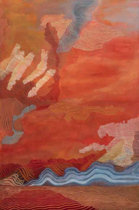 Some of Cheshire’s most powerful works reference the Atherton Tablelands where she was born and raised. You Are Your Landscape depicts the rainforests, rivers and lakes but also mapping Cheshire’s spiritual journey where she first experienced “…The awe, and wonder of place and the conviction that there was something greater than humanity: a Divine essence so to speak”.