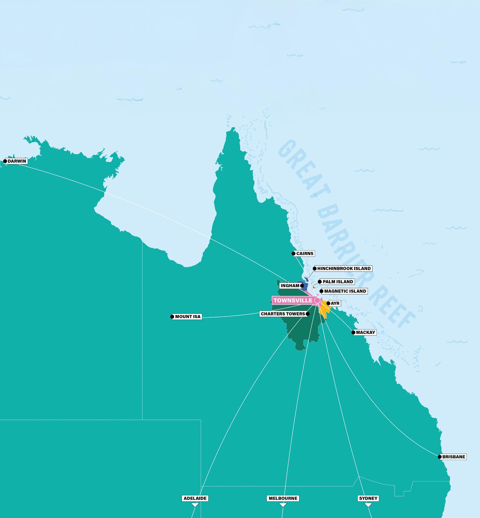 The Townsville North Queensland region extends across 80,000km2 and includes traditional custodians across diverse landscapes with Townsville at its heart, Hinchinbrook to the north, Charters Towers to the west, the Burdekin in the south and across the Great Barrier Reef and its islands along the east coast, including Palm Island
