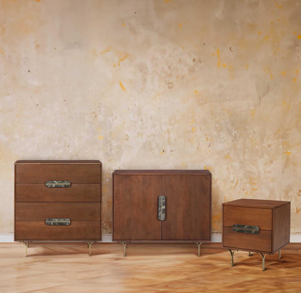 Retro meets chic in the Steen Collection! Crafted from mango wood with a rich walnut finish, the collection includes a cabinet, chest and side table, each flaunting green forest marble handles inlaid with brass. With sturdy, arched metal legs, Steen brings maximum style with a minimalist design.