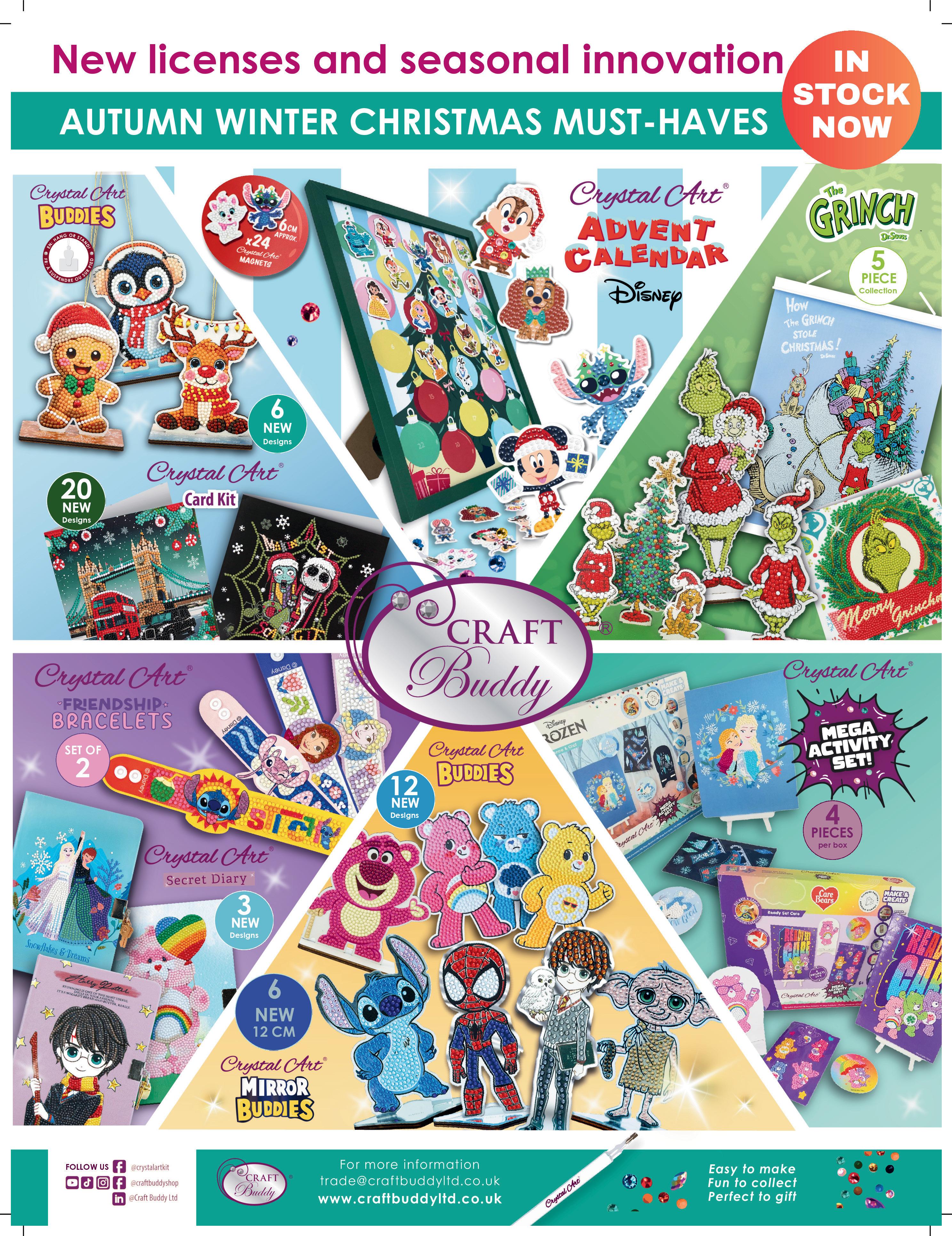 New formats, strong licences, best-sellers and award-winning evergreen lines position Craft Buddy’s Crystal Art ranges as a brilliant range to stock for autumn/winter and Christmas, with perfect stocking fillers and gifting products for the festive season.