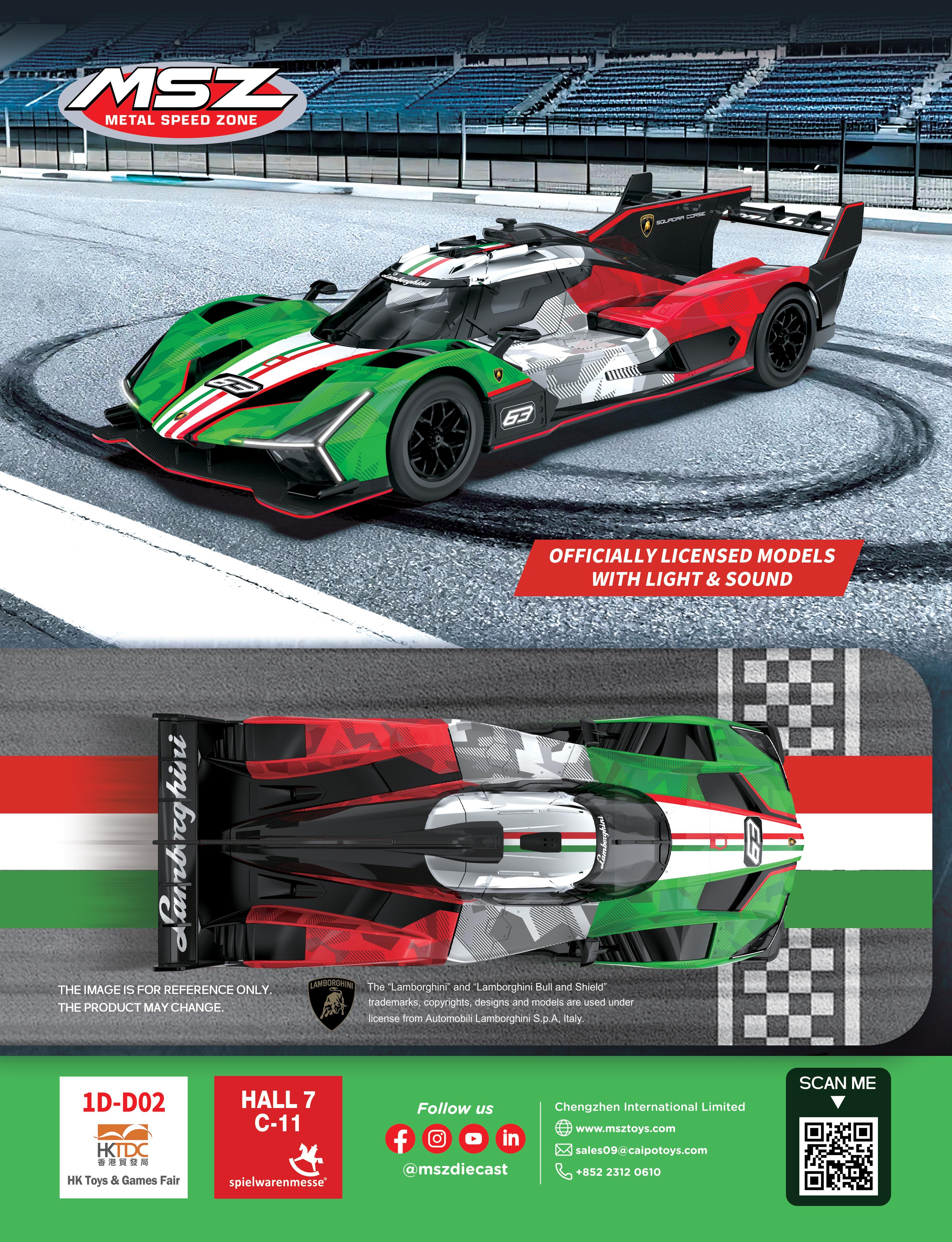 MSZ’s 1:43 scale series (about 4.5”) features a wide array of cars spanning street, JDM and racing cars. There’s something for everyone, from children to collectors. The compact die cast are ideal for driving sales in the Pocket Money category and will be joined by new models the Aston Martin Vanquish and Subaru WRX, both expected to hit the market soon. Whether for play or display, these models are ideal for car enthusiasts. Looking ahead, Chengzhen is placing greater emphasis on its 1:24 scale line. The upcoming lineup includes the Lamborghini SC63 and the 1970 Chevrolet Chevelle 454, both under development and set to launch in the first half of 2026. These models will also feature MSZ’s signature light and sound functions, making them irresistible to collectors and kids alike.