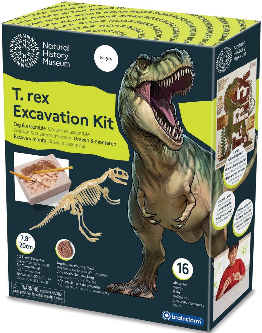 The Natural History Museum T-Rex Excavation Kit is a hands-on set that comes with tools to chip and brush to reveal a realistic prehistoric skeleton, which can be assembled into a 20cm model. The kit also includes a replica ammonite fossil. A colourful poster adds to the experience, while a secret code unlocks extra T-Rex facts online.