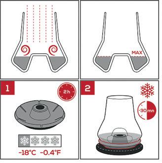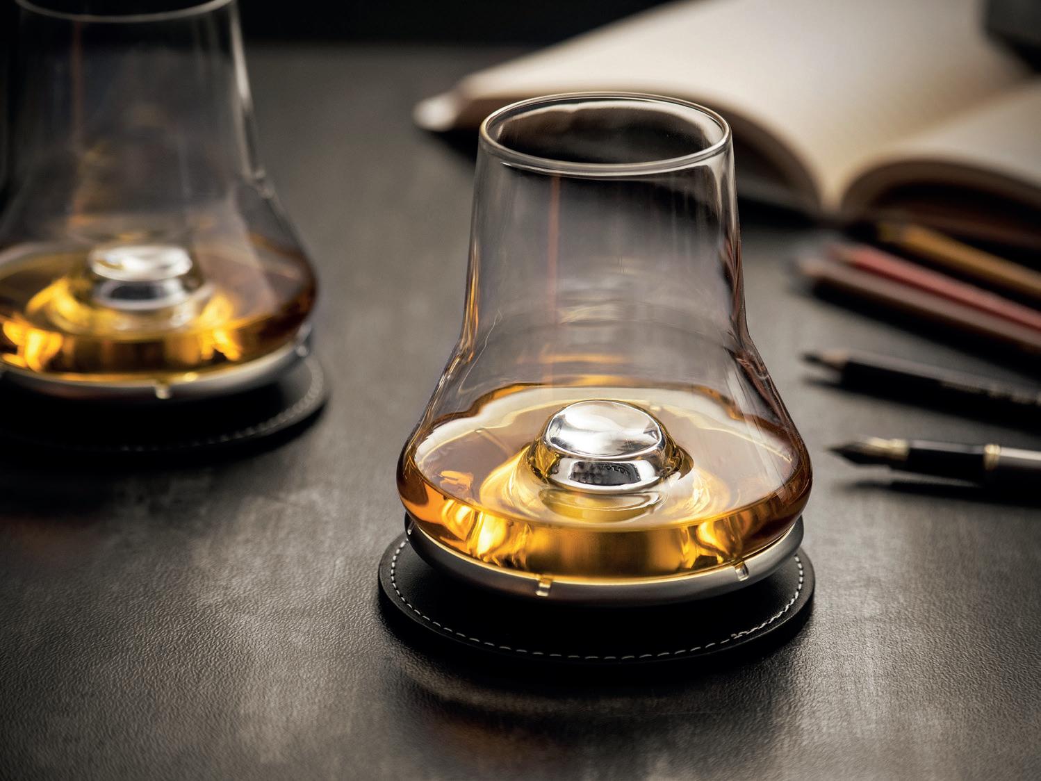 bConservare la base refrigerante nel congelatore idealmente per 2 ore. Il livello del whisky versato non dovrebbe superare il punt la cui funzione è di dividere il liquore per evitare un’innalzamento prepotente dei vapori alcolici al naso. Senza l’uso del ghiaccio, non si crea lo sbalzo termico che inibirebbe il rilascio dei profumi e degli aromi del distillato.