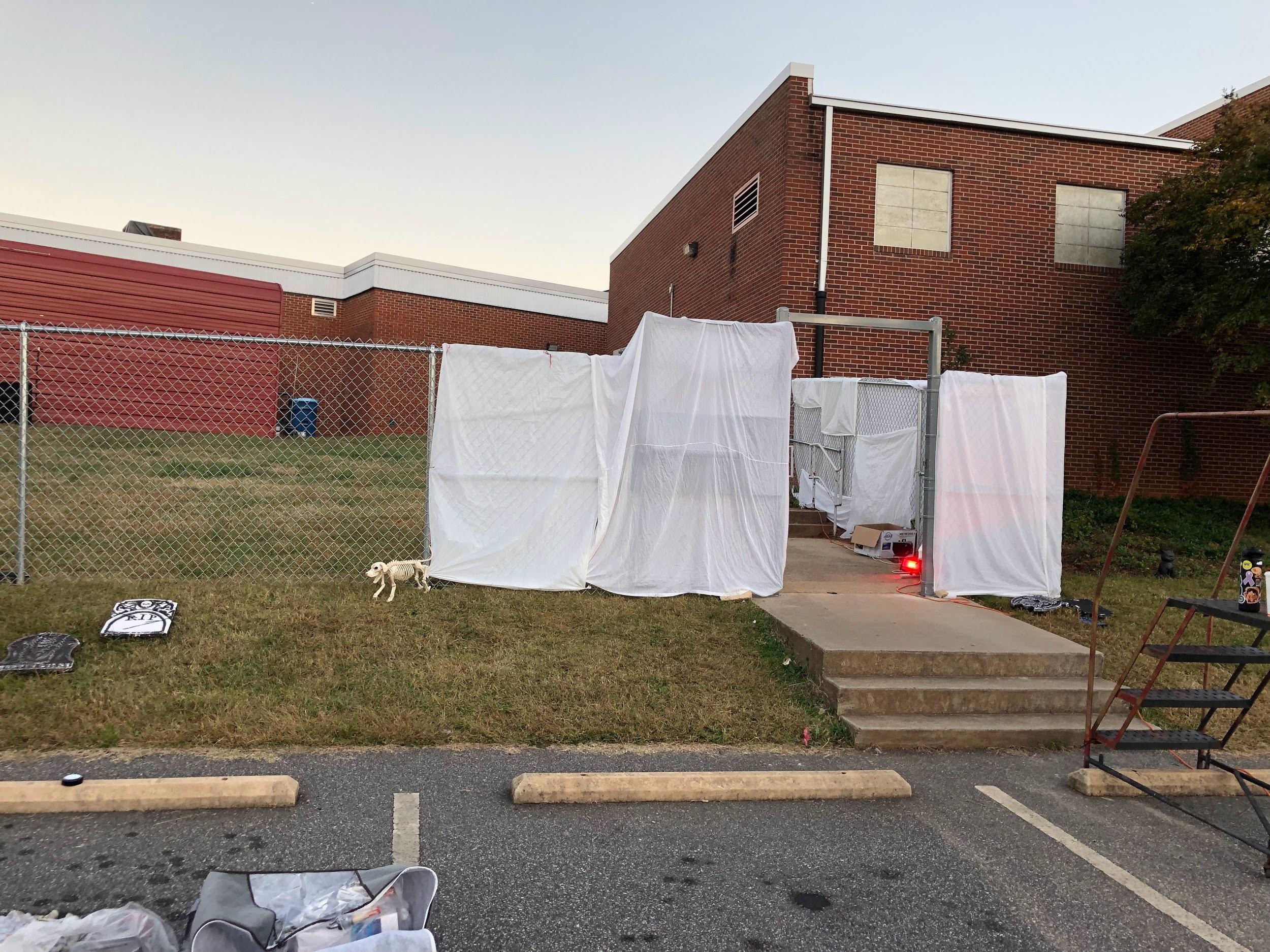 To the right of the entrance, set up the coffin that Nik will come out of in the center of the grass in front of the tree.