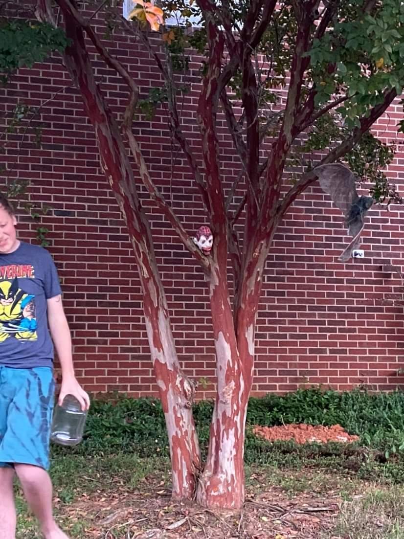 To the right of the entrance, set up the coffin that Nik will come out of in the center of the grass in front of the tree
