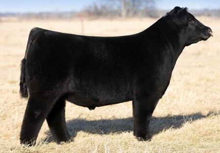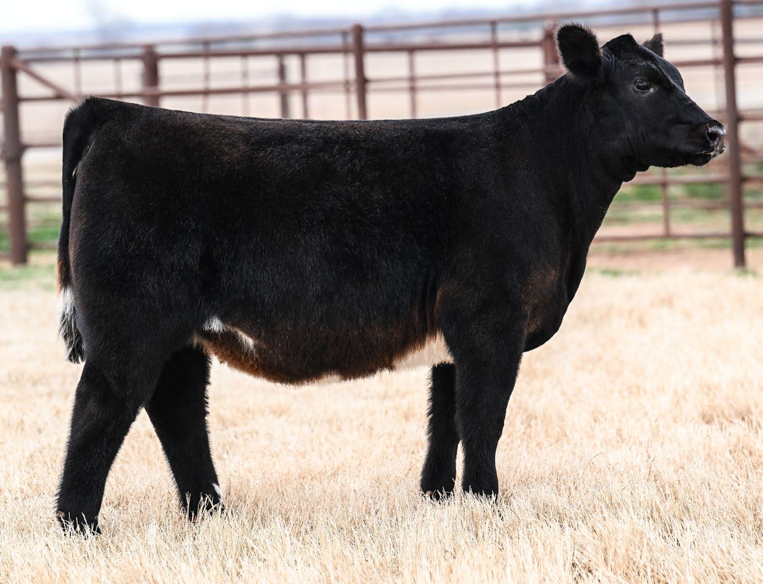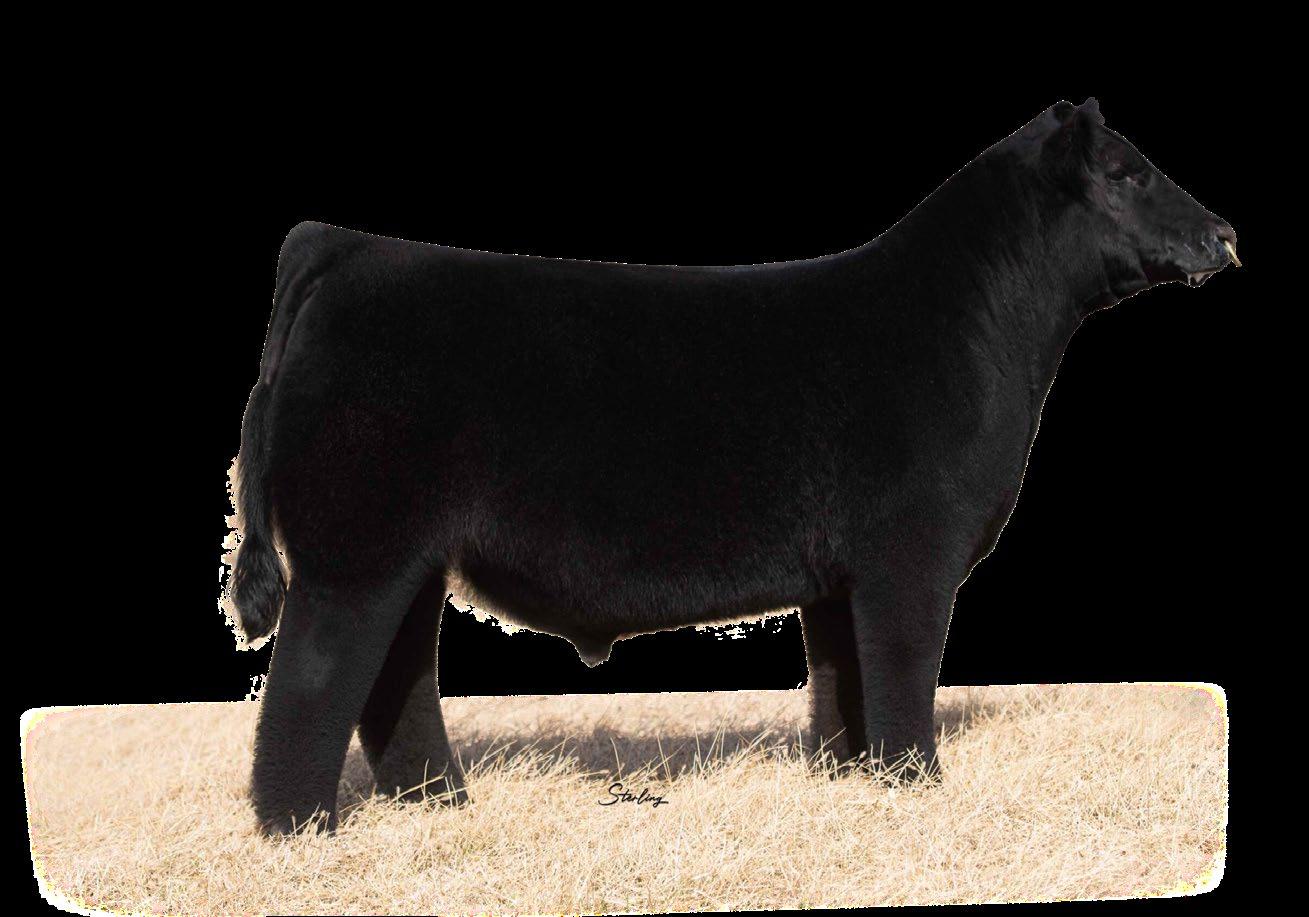 • Here is a powerfully constructed, bold bodied heifer that offers the added shape, width and dimension needed to compete in the Commercial/AOB/Market heifer realm and one that would be a perfect candidate for the American Royal Steer Momma Show. Her captivating look from the side highlights length and extension, round rib shape and extra depth of body. Additionally, this stout featured heifer is wellbalanced and offers a unique color pattern.