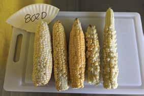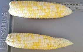 4-B. Sweet corn grading differences in 2024, under the red clover treatment. Sweet corn on the top would be considered US Number 1, and the ear on the bottom is US Number 2. Sweet corn grown in 2024 under red clover treatment, were lower quality but still considered marketable. Much of the lower standards came from lack of tip fill, and not prime kernel development (not straight rows).