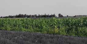 2-A. Sweet corn on Jul 9, 2024. Sweet corn shown growing in white clover, red clover, and bare ground - left to right. Heights of the sweet corn in the clover treatments are similar to the bare ground. In 2024, although the clover treatments appeared to be a week behind development of the bare ground, the clover end of season stalk heights were within 10 centimeters of each other. The sweet corn stalk height was less of an indicator in the struggles of the sweet corn growth, than the differences in growth stages between the bare ground and clover plots.