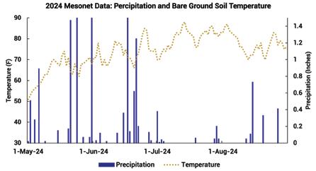 Figure 1-A. Precipitation and bare ground soil temperature at four-inch depth, as sourced from the South Dakota Mesonet data for planting date of May 13, 2024, at Beresford Southeast Research Station. Soil temperature in Bare Ground was 76-degrees, which is warm enough for non-treated, organic sweet corn to be planted.