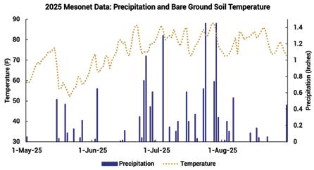 Figure 1-B. Precipitation and bare ground soil temperature at four-inch depth, as sourced from the South Dakota Mesonet data for planting date of May 14, 2025, at Beresford Southeast Research Station. Soil temperature dropped to below ideal sweet corn planting temperature of 65-degrees Fahrenheit from May 15 until May 31, 2025.
