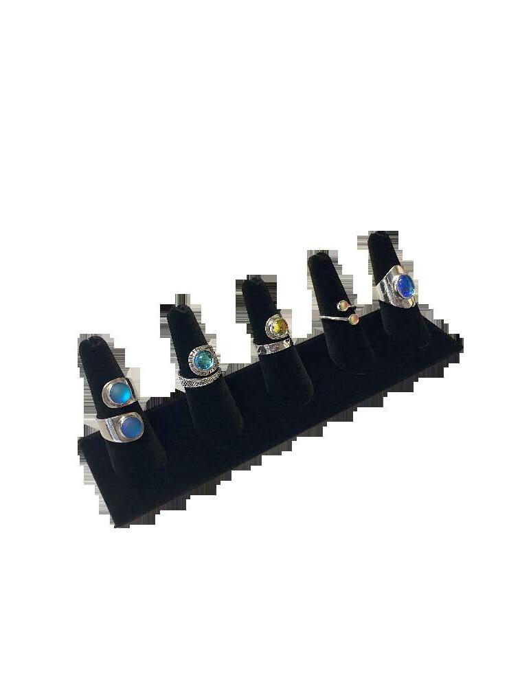 Five ring display made of wood and covered in black velvet. Jewelry not included.