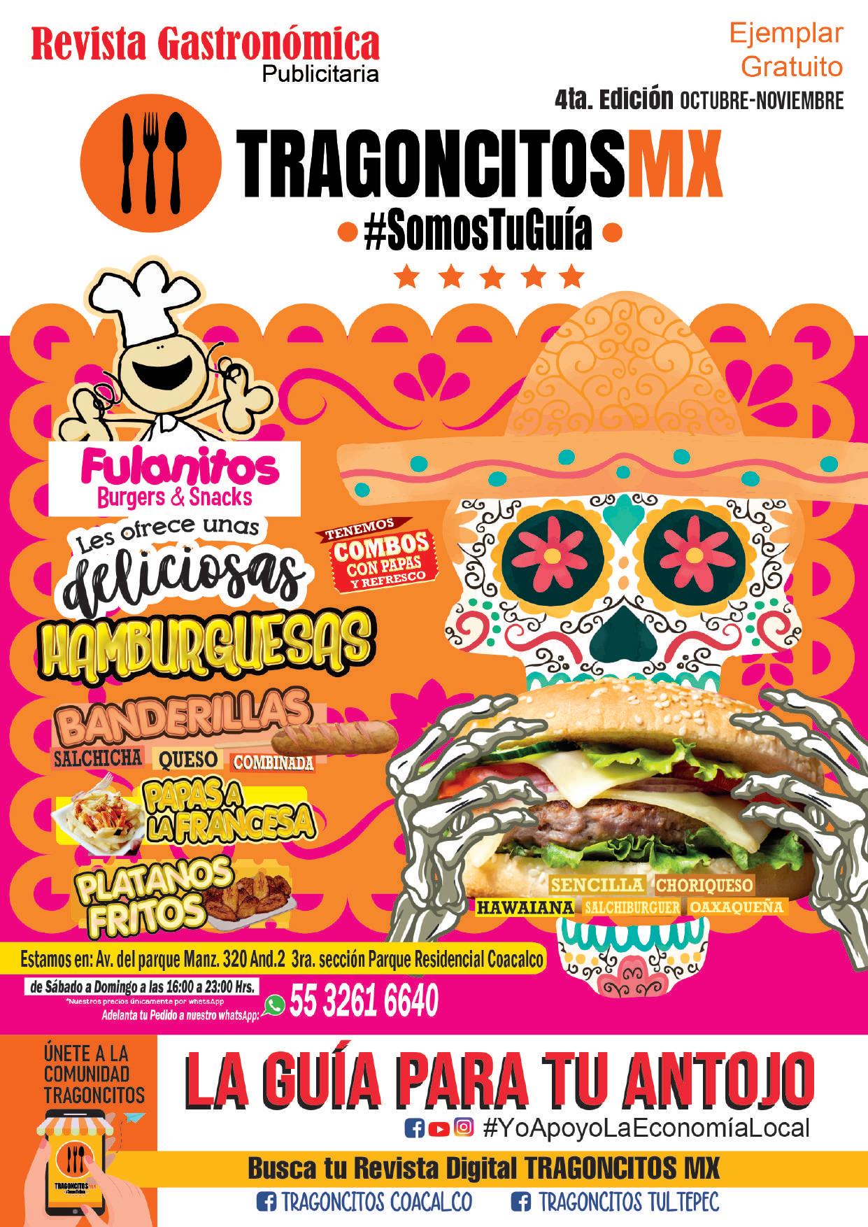 Costillas Papas a la Francesa Alitas Hamburguesa SNACKS Ven y pasa un momento agradable, tenemos una gran variedad en Menú Horario: Jueves a Sábado 6:00 pm a 10:30 pm Domingo 2:00 pm a 9:00 pm CONÓCENOS!! SERVICIO A DOMICILIO 55 78640537 SERVICIO PRESENCIAL Calle Noche Buena Esq. Zarzaparrilas Mz 32 lt. 27 (Planta Baja) TRAGONCITOSMX 3