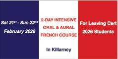 Final chance to book a place on Brú na Páirce’s intensive Oral & Aural French course for Leaving Cert 2026 students taking place in Killarney on the weekend of 21st & 22nd February. Delivered by highly experienced Irish and native French teachers, our intensive course will provide you with the knowledge and confidence, both orally and aurally, to achieve the highest possible grade in your Leaving cert exam through: