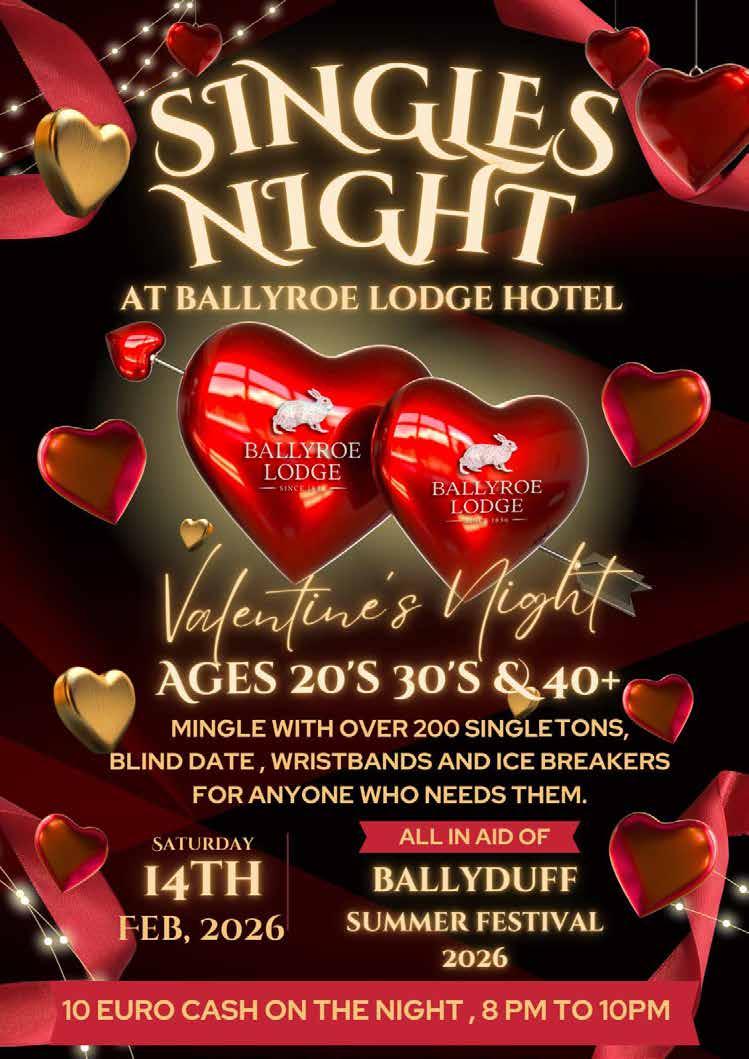 Our Club Social takes place Sat 28th Feb at the Meadowlands Hotel. Tickets €60 include a 3-course meal and live music. The Bill Doody Memorial Tournament is on Sat 31st Jan (11.30am–3.30pm), supporting Irish Sepsis & Motor Neurone Disease charities. Men’s games in Caherslee; Ladies in Mounthawk. Music and food in the clubhouse afterwards. All welcome.