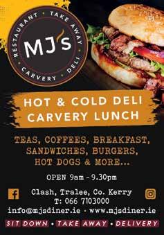 Entertainment and Eating Out in Tralee OPENNOW ORDER ONLINE www. royalindiatralee.ie Open Every Day (Except Tuesdays!) TEL: 066-7144777 OPENING HOURS MONDAY - SUNDAY4pm-11pm Delivery Service Manor West, Tralee, Co. Kerry 7 DAYS A WEEK: 4.30PM TILL LATE DELIVERY CHARGE €3.50 (under 3km) FREE bottle drinks when order over €40 NEW FREE prawn crackers with every order Sit down Restaurant & Take-away Unit 5c, Horan Centre, Tralee Call: 066-7193720 Open: Mon-Sat: 8am-5pm | Sunday 9am-5pm Bank Holidays - Closed Breakfast • Carvery • Lunch HORAN CENTRE DELI DELI JG ALL DAY BREAKFAST ...FROM €5 LUNCH...FROM €7 (11AM-5PM) KIDS MEAL DEAL! Nuggets or Sausages & Chips & Juice ONLY €6 OPEN 7DAYS Advertise your Food business here! THIS SLOT IS AVAILABLE! Low cost Effective Advertising CALL US ON 066-7126399 Advertise your Food business here! THIS SLOT IS AVAILABLE! Low cost Effective Advertising CALL US ON 066-7126399