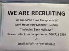 following positions are available: • A Part-time Registered Nurse for its Day Care Centre (2 Days weekly - 16 hrs ( Monday and Saturday week 1 and Tuesday and Wednesday week 2) • A Part-time Registered Nurse for our Stroke Day Care Service (1.5 days pwk – every Monday and one other half day ). For job specification or for further information please contact: Rose Daly, Nurse Manager Baile Mhuire Day Care Centre 066 7123373 or email rosedbailemhuire@gmail.com. Requirements • 5 years nursing experience. • Also it is desirable to have experience in care of the older persons and also promoting health and wellbeing for Stroke survivors. JOB OPPORTUNITY