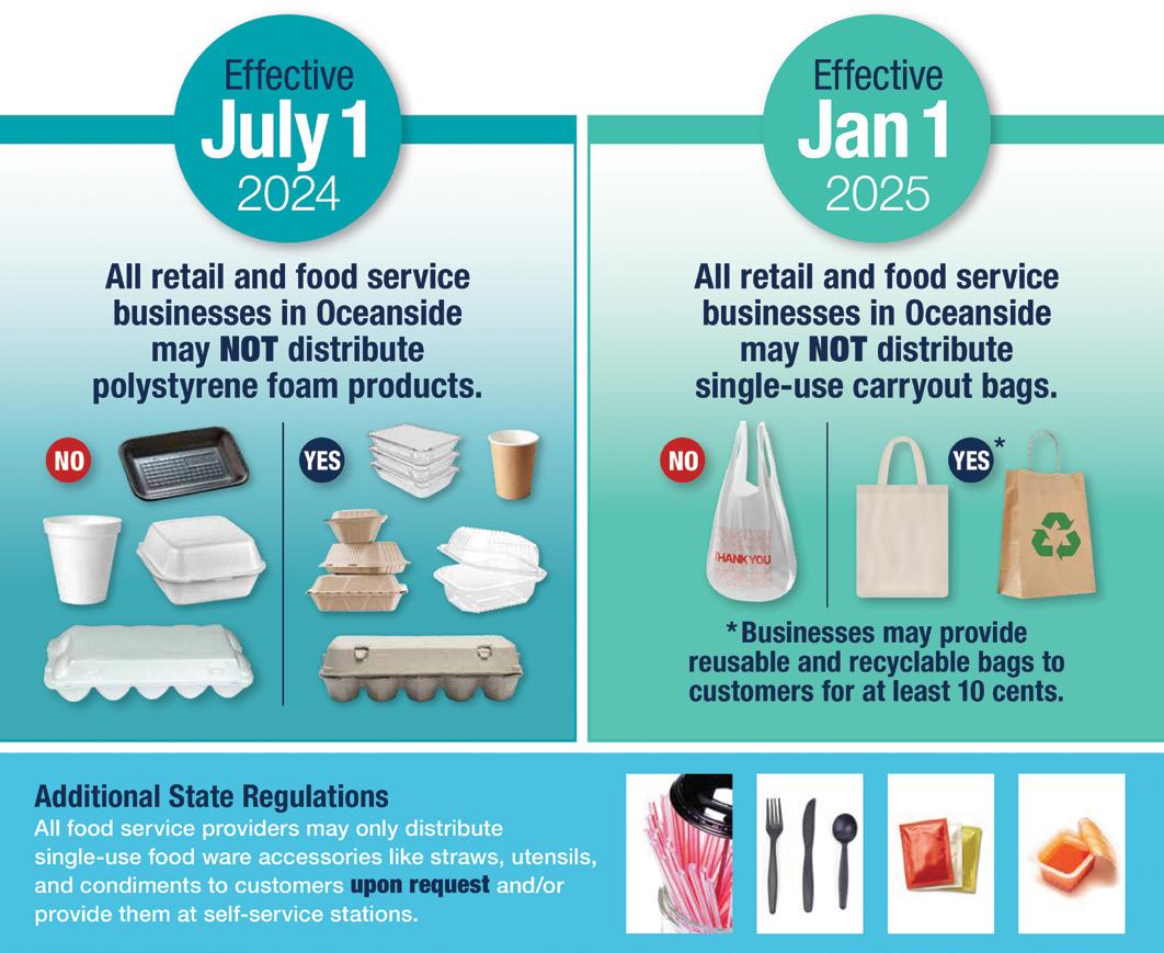 The City of Oceanside’s Marine Debris Reduction Ordinance will go into effect soon! This new ordinance requires businesses throughout Oceanside to find sustainable alternatives to single-use food serviceware and addresses everyday items that are used only once. Oceanside businesses including but not limited to retail establishments, food service providers, street vendors, hotels, food trucks, and clothing stores will no longer be able to provide polystyrene foam and single-use plastic bags. These products are made of materials that never break down and oftentimes end up as litter in our parks, waterways, and beaches.