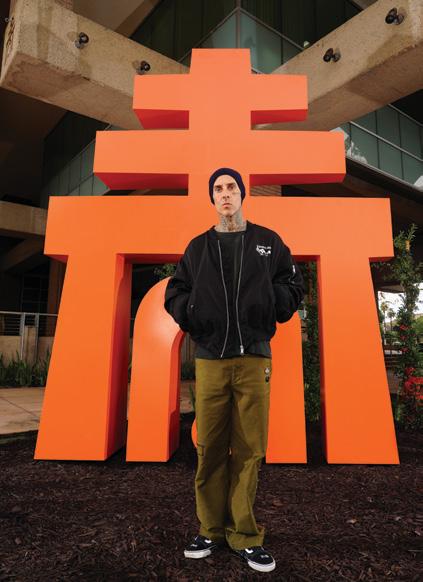 Travis Barker in front of Riverside City Hall's new Raincross sculpture by Rico Alderette.