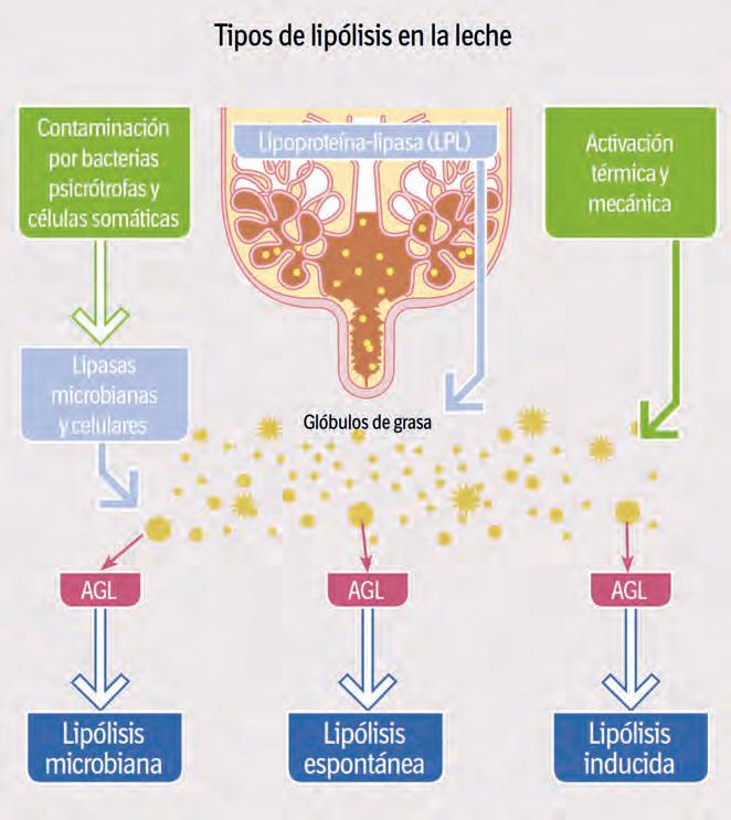 Si la lipasa natural fuera la única causa de lipólisis los daños serían limitados, pero en el tiempo que transcurre entre el ordeño y el tratamiento de la leche se desarrolla una flora bacteriana de especial significado: la flora psicrótrofa. Este desarrollo es tanto mayor cuanto lo es el tiempo que transcurre entre el enfriamiento en la granja, la recogida y el almacenamiento en la fábrica. Es importante recordar que la leche, después de ser recogida en la granja, continúa siendo transportada y almacenada en la industria antes de su transformación. La concentración de AGL en la leche aumenta en cada una de las etapas del proceso productivo y de almacenamiento.