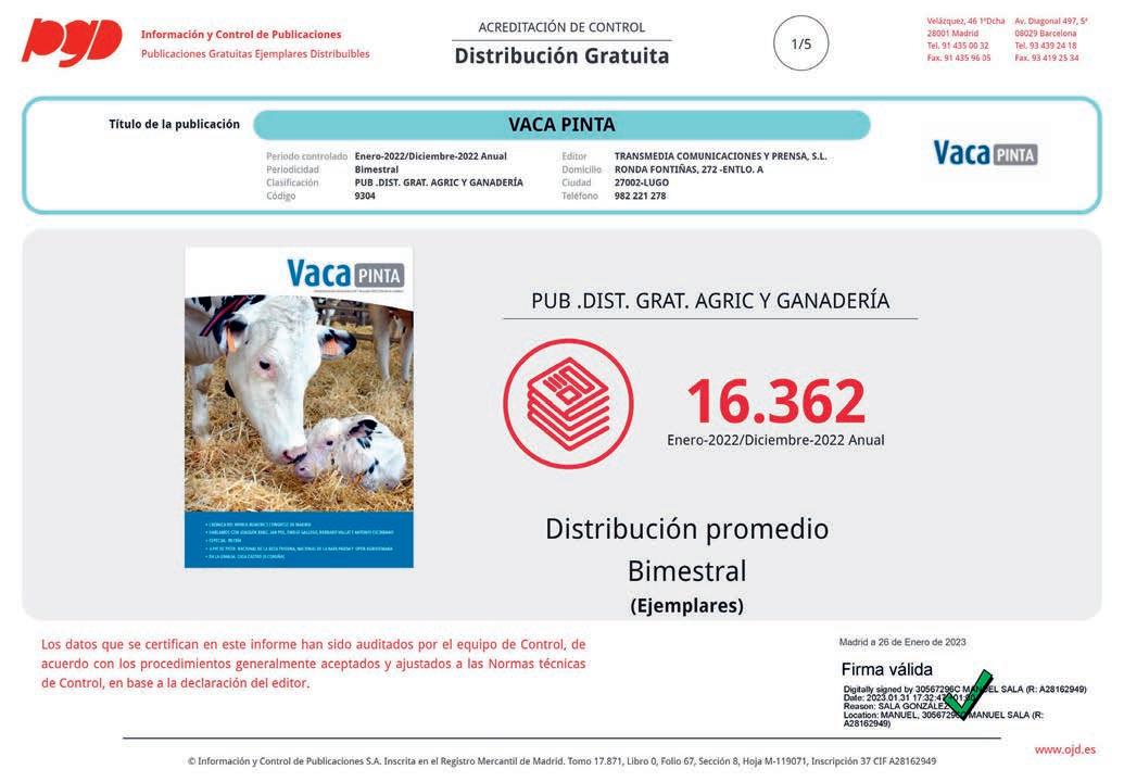 Se trata del quinto ejercicio en el que la acreditamos a través de una auditoría externa cuyo informe para 2022 registró una media de 16.362 ejemplares por número, los cuales se distribuyen entre ganaderos, veterinarios, técnicos, casas comerciales y demás profesionales del sector del vacuno lechero de España y Portugal tanto por correo postal como a través de asociaciones y cooperativas con las que colaboramos. La entidad oficial encargada de realizar las auditorías de audiencia OJD, para medios de pago, y PGD, para medios gratuitos, ha sido un año más Información y Control de Publicaciones SA.