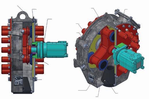 CÁMARA CON GRASA MOTOR DE TRANSMISIÓN RESPIRADERO(S) VÁLVULA DE UNA VÍA BLOQUE DE ACEITE HIDRÁULICO RETÉN DE DOBLE LABIO CONO DE CONTROL DE FLUJO CUCHILLAS CORTANTES (6 UNIDADES) PIEZAS DE NYLON (REDUCEN LA FRICCIÓN) SALIDAS DE Ø 45 MM EJE ROTATIVO FÁCIL ACCESO PLACA DE DESGASTE HARDOX