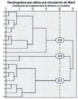mayor relevancia de los costes de los alimentos producidos. El análisis de conglomerados jerárquicos (ACJ), mediante el dendograma y las tasas de variación de los coe cientes de conglomeración, propone como solución óptima agrupar a las 22 explotaciones en tres grupos: grupo 1, con 9 explotaciones; grupo 2, con 11 explotaciones y grupo 3, con 2 explotaciones ( gura 1).