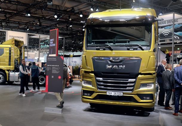 porte les motorisations à 440, 480 et 520 ch, avec un couple respectif de 2250, 2450 et 2650 Nm. Selon MAN, les diverses amélio rations apportées (entre autres) à la culasse et aux pistons permettrait de consommer jusqu’à 3 % de carburant en moins. Quelques détails aérodynamiques apportés à la cabine et de nouveaux déflecteurs permettraient de gagner encore 1 % supplémentaire en trans port longue distance sur le TGX. Pour voir MAN utiliser la plate-forme commune du groupe Traton, il faudra semble-t-il attendre jusqu’en 2024, ce qui permettra au construc teur allemand de se mettre tout de suite en ordre avec la future norme Euro 7. Chez Scania, c’est un nouveau moteur à gaz qui était mis à l’honneur. Il délivre 420 et 460 ch et est compatible avec le biomé thane, ce qui permet de réduire les émissions de CO 2 jusqu’à 90 % du puits à la roue. Avec ce nouveau moteur, Scania va considérable ment élargir sa gamme LNG, qui se limitait jusqu’à présent à un seul niveau de puissance de 410 ch.