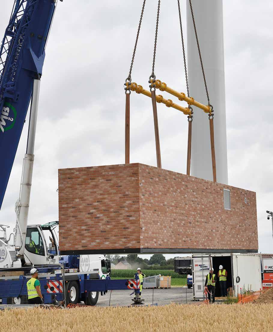 Voor de installatie van een hoogspanningscabine op een windmolenpark in Liernu, in de buurt van Eghezée, werden de afdelingen MB Transports en MB Manutention ingeschakeld.