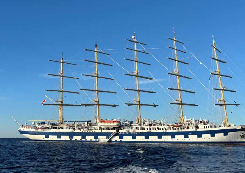 The Royal Clipper is the largest of Star Clippers’ three tall ships, an impressive sailing vessel that defies simple description. In the cruise port of Civitavecchia, the ‘big players’ of other cruise lines are docked, but all eyes turn to this extraordinary ship... With its five tall masts (featuring 42 sails) and narrow deck, it’s easy to forget this is a luxury cruise ship—until the boarding