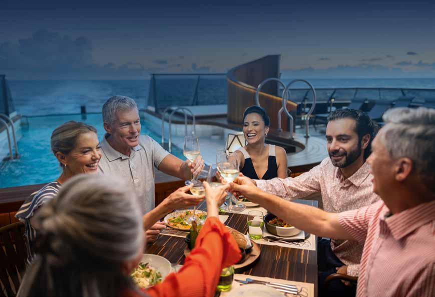 architectuur in de atrium. Een verbluffend ontwerp dat is gecentreerd rondom een iconische trap en een schitterende kolom van licht en kristal die zich uitstrekt van de vloer tot het plafond. Op veel plaatsen op het luxe schip vervagen de grenzen tussen ontwerp en structuur. Hoogtepunten zijn onder andere een nieuwe Crêperie aan boord, die ‘s ochtends versbereide crêpes en wafels serveert en ‘s middags een weelderige selectie gelato; een nieuwe sociale hub boven op het schip, met een weids uitzicht op het zeelandschap en een perfecte plek voor stille overpeinzing. Hier komt de sfeer van een woonkamer samen met leren, en deze nieuwe ruimte brengt de bibliotheek en het digitale centrum samen om onze gasten op een nieuwe manier van dienst te zijn; en vijf specialiteitenrestaurants, waaronder de nieuwe signature restaurants Ember en Aquamar Kitchen, zonder extra kosten. Er zijn tal van uitnodigende plekken, van de voortreffelijke restaurants tot de innovatieve bars en van de fantastische spa tot het prachtige dek. Wat ze allemaal gemeen hebben, is rijk design, ruimte en comfort dat aanvoelt als een thuis weg van huis.’