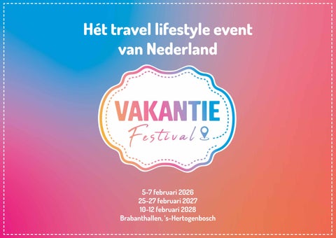 Bereik een reislustig publiek en geniet van exclusieve branding, een gepersonaliseerd programma, online en offline zichtbaarheid, promotie via Vakantie Festival socials en inclusief aftermovie.