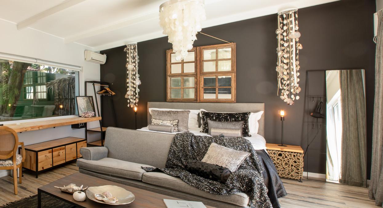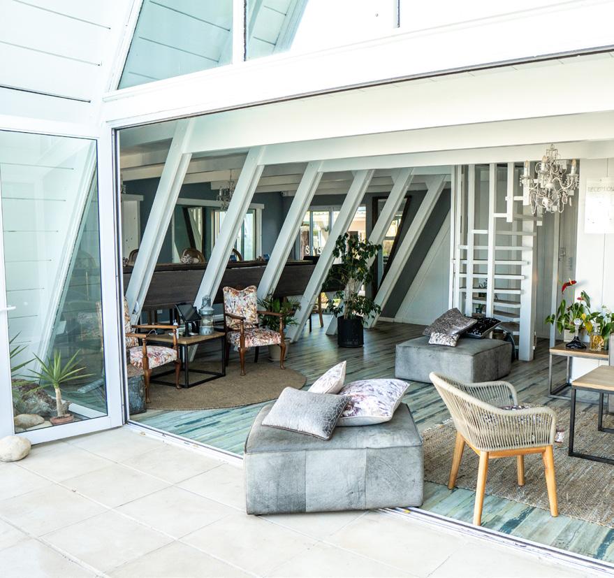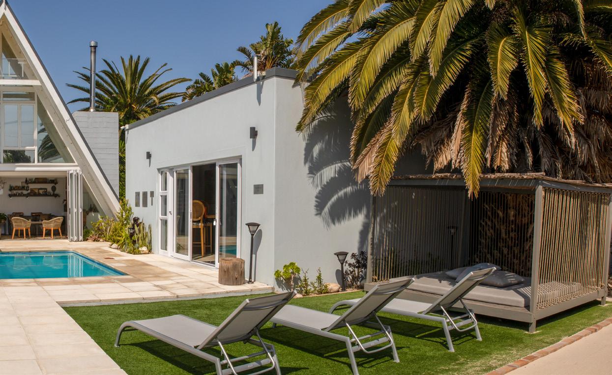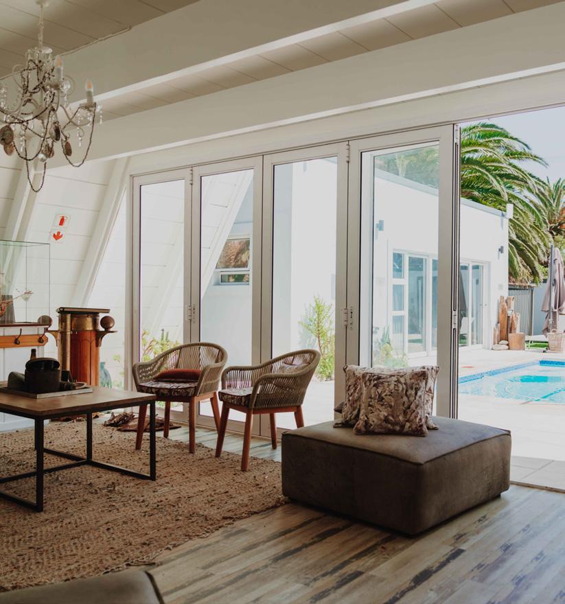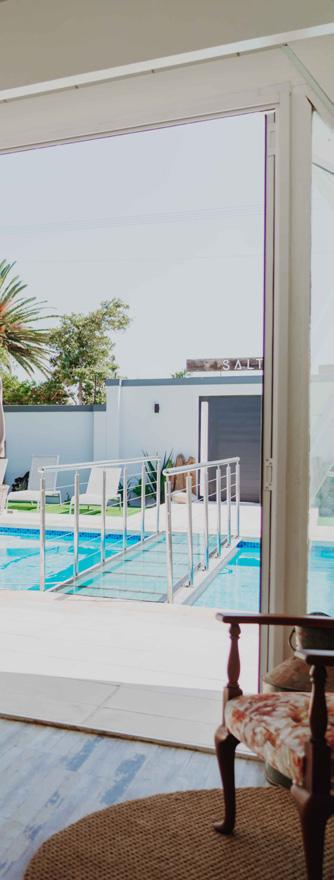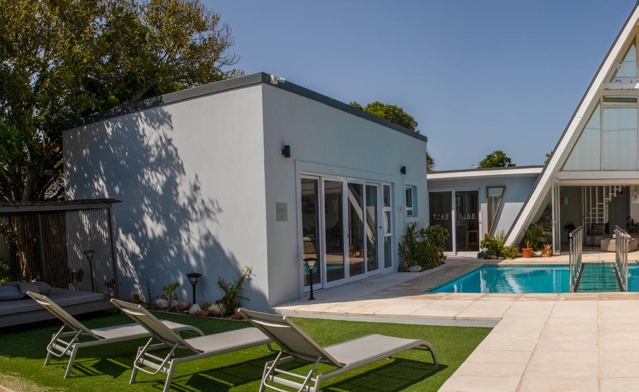 SALT is a 5-star 8-bedroom bou tique guest house in Blouberg, one of Cape Town, South Africa's premier holiday destinations. Just a stone's throw away from the ocean, close to the windsurfing capital beach, a quick ride from the surrounding Winelands and under 30mins drive from Cape Town International airport, SALT invites you to indulge in all that makes this location exceptional while relaxing in the many ame nities the village of villas offers; pool, cabanas, massage room, co-working space, lawns for yoga and relaxing, entertainment areas and a large open-plan kitchen. Its rusty mottled metals, rough ropes, shiny seashells, and weath ered woods talk to the coastal sur rounds in a tasteful and curated way. The reuse of materials from one journey to the next, calls for upcycling, reinventing and con sciously designing forward.