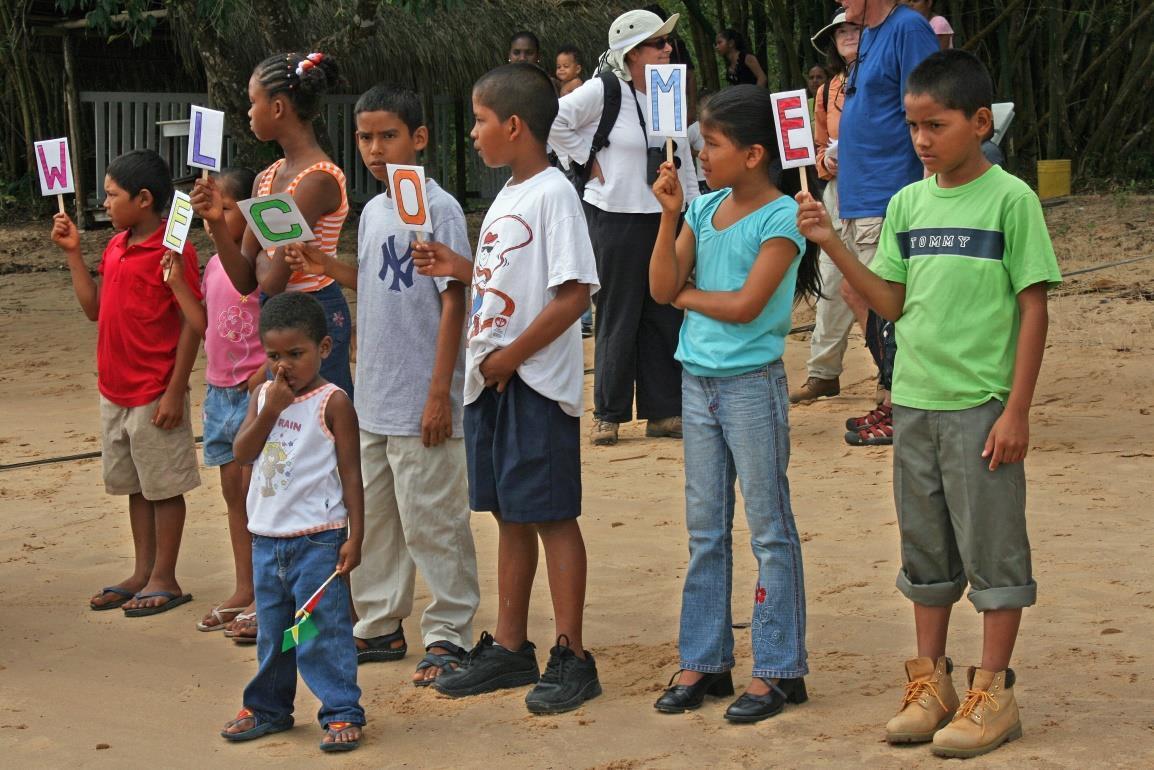 None of this means that we wouldn’t have wanted to visit a village where folks of African descent live as well. None of the foregoing means that the folks at that Suriname village weren’t glad to see us even though their greeting wasn’t as touching. It was much more laid back and even a little bored. Of course, it didn’t involve the schoolchildren from ages 5 to 12 with their signs proclaiming “Welcome”, letter by letter.