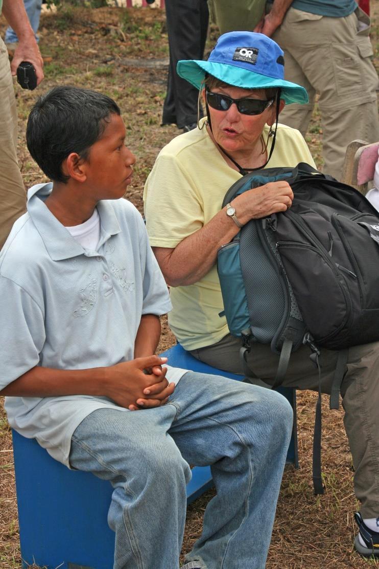 This young Amerindian boy took a liking to me for some reason almost as soon as we alit from our zodiac onto the beach at Saxacalli. He was slender and shy but eager to be with Kay and me. He sat with me through the presentations by the village elder, the songs of the elementary school children and the little talk by the schoolteacher. I asked him why he was not with the other children and he gave me a condescending look while informing me that he was 14 years old and attended a boarding school across the river in an actual city!