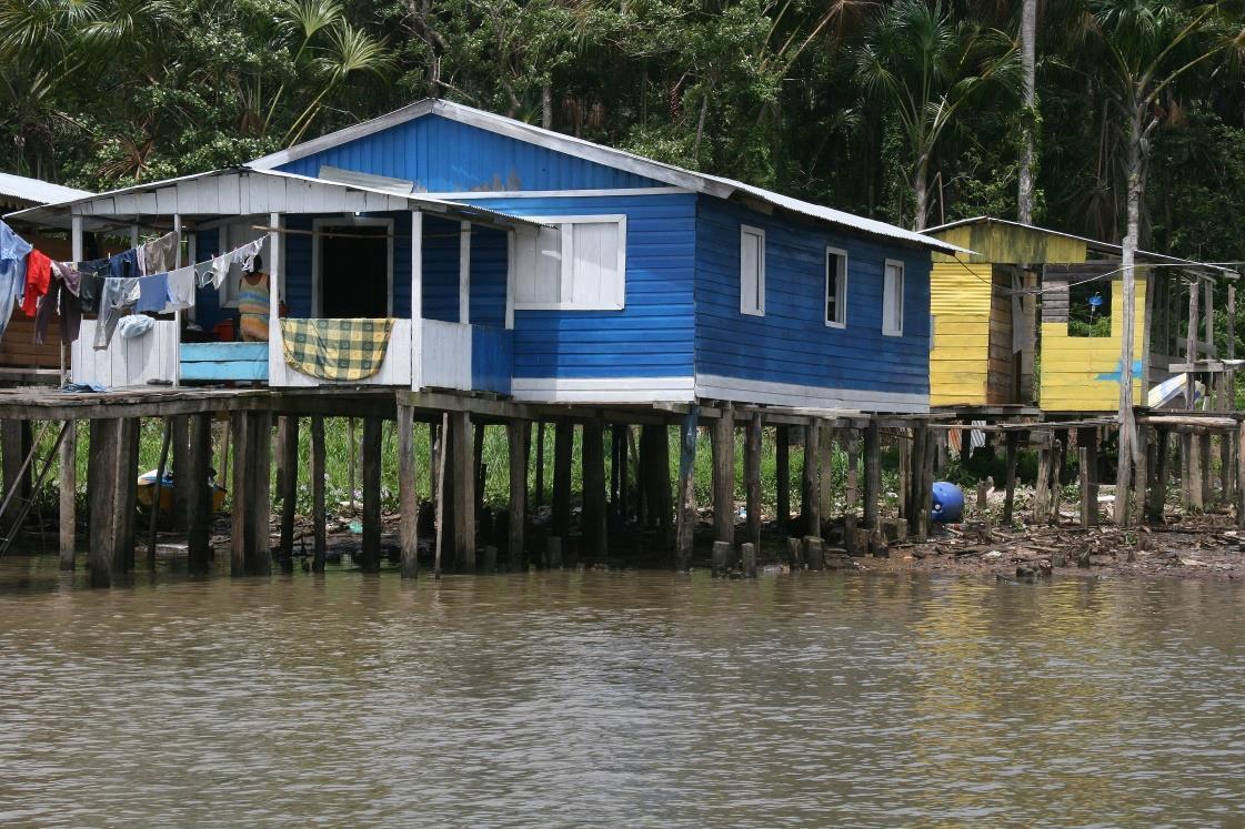 The town’s front streets project out over the river waters and the back streets have been gouged out of the jungle lining the river. There is no shade in the town other than that beneath the thatched or tin roofs of the dwellings. Some of these are very basic and others show the attention of their builders to more detail with painted wood and designs added to the walls. There is most definitely a high rent and a low rent district too. The “richer”