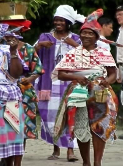 Along came 5 ladies of varying ages from probably about 18 to 60. They were dressed in bright cloth headdresses and big wide colorful skirts with matching blouses. They strutted along like black ladies in Africa who can balance heavy loads on their heads and yet appear as graceful as gazelles! To the insistent beat of the drums and the brass, these ladies performed what we were told was an Amerindian change of clothing ritual for a young woman about to be married Well, the music was black jazz, the dancers were black ladies, black men played the music, and the clothing looked like it was straight out of Africa! Honest and truly, there was nothing Amerindian about the entire experience.