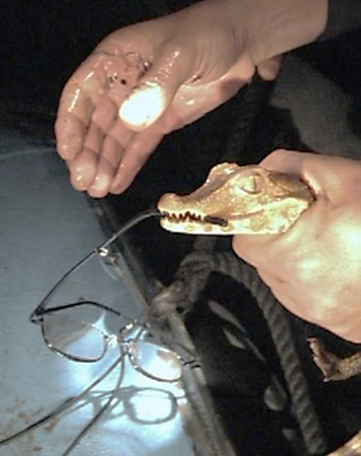 fairly interesting things as we “puddled into butter” in our seats. The guide pointed out a good-sized Spectacled Caiman about 5 feet long; he gave us an open-mouthed smile that showed all his formidable teeth. We saw numerous Little Blue Herons, many Cattle Egrets, a Spotted Sandpiper, Little Green Herons, some wonderful Amazon Kingfishers with their bright white neckband and iridescent navy blue color, and even some Green-Throated Mangrove Hummingbirds.